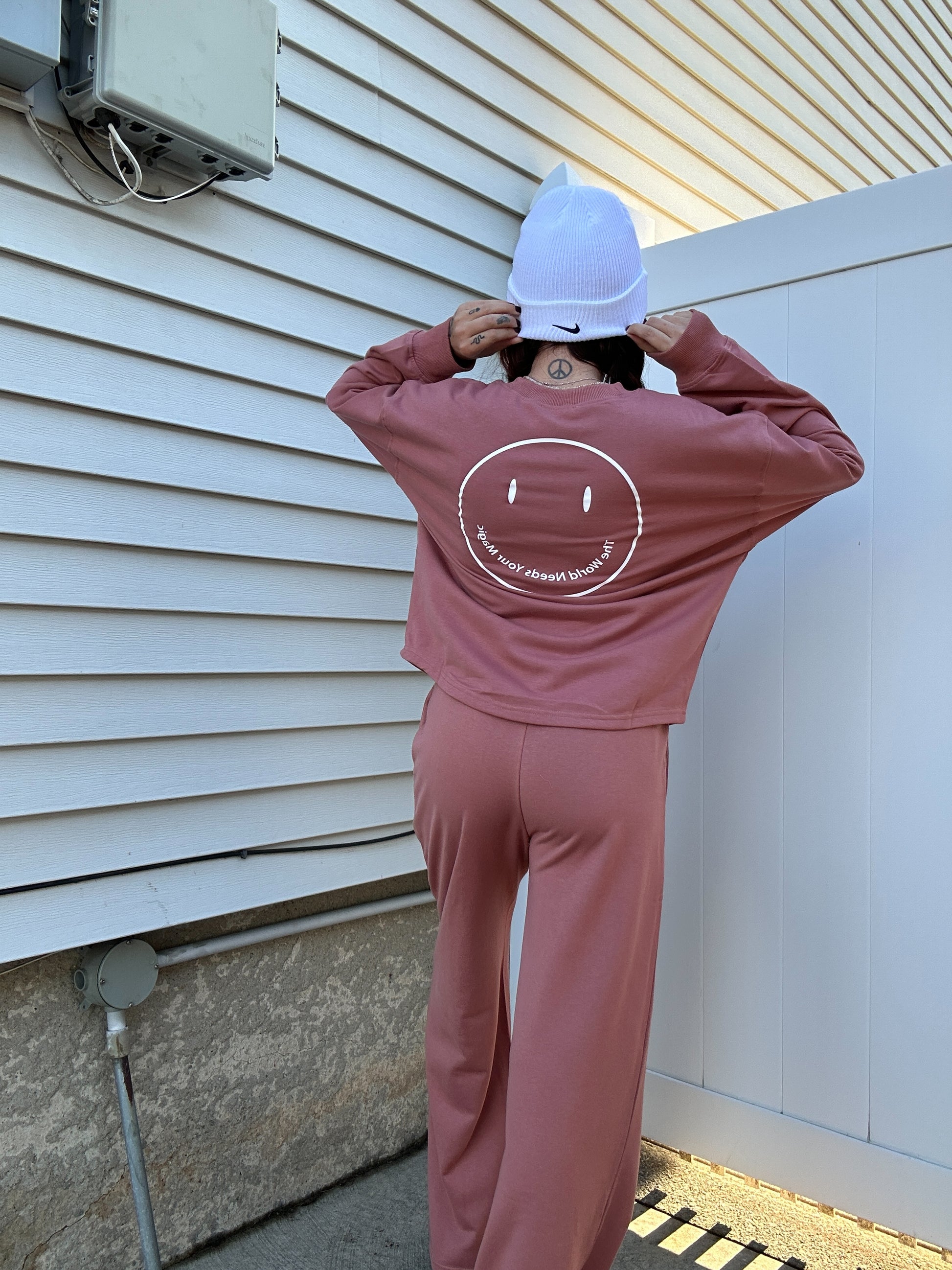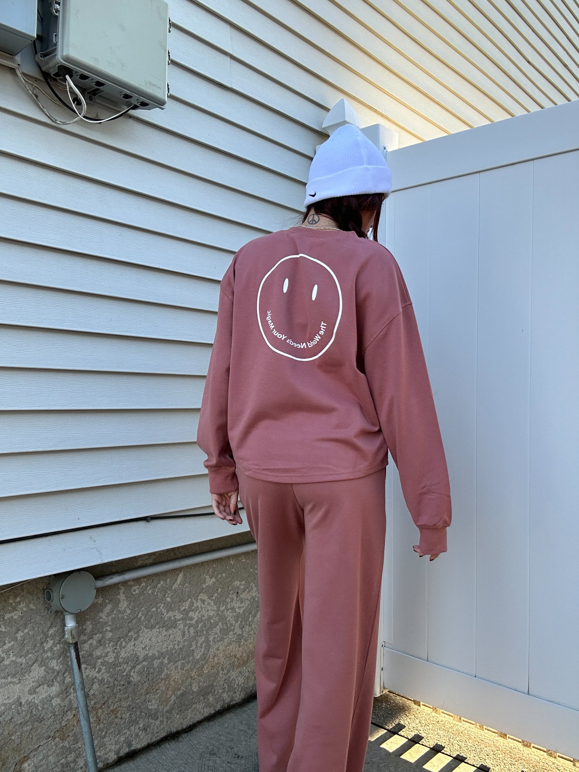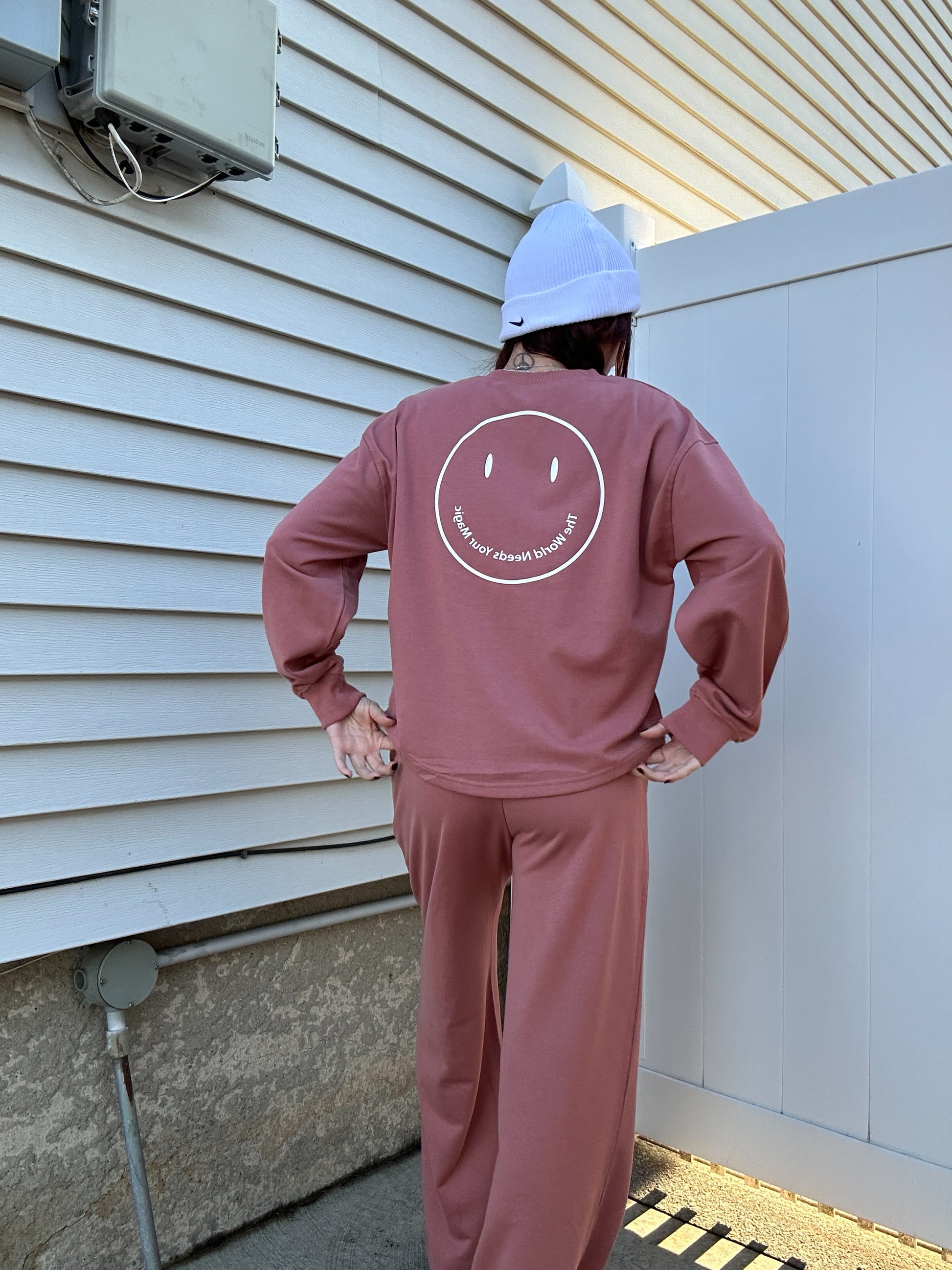 - Screen print happy face graphic "the world needs your magic"